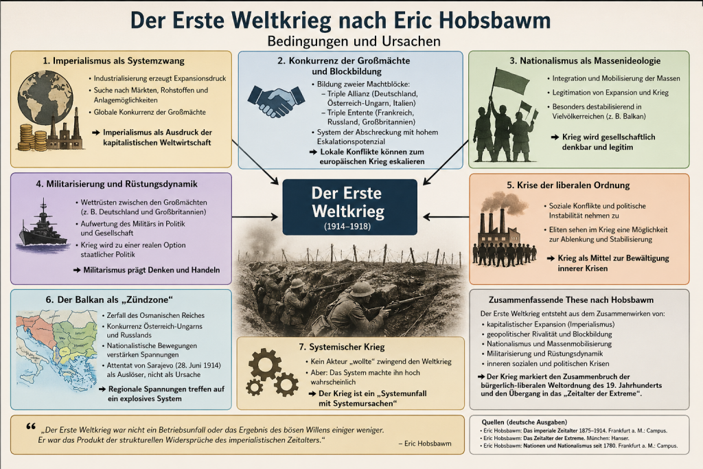Diese Grafik verdeutlicht, warum es für historisch-politisches Lernen bedeutsam ist, die Analyse von Eric Hobsbawm zu erschließen. Seine Perspektive ist deshalb zentral, weil sie den Ersten Weltkrieg nicht als Zufall oder bloßes Versagen politischer Akteure interpretiert, sondern als Ergebnis tiefgreifender gesellschaftlicher Strukturen. Auf diese Weise ermöglicht sie ein kritisches Verständnis moderner Kriege, das ökonomische, politische und soziale Dynamiken zusammendenkt. Hobsbawm liefert damit eine Erklärung, die über eine reine Ereignisgeschichte hinausgeht und langfristige Bedingungen und Ursachen sichtbar macht.