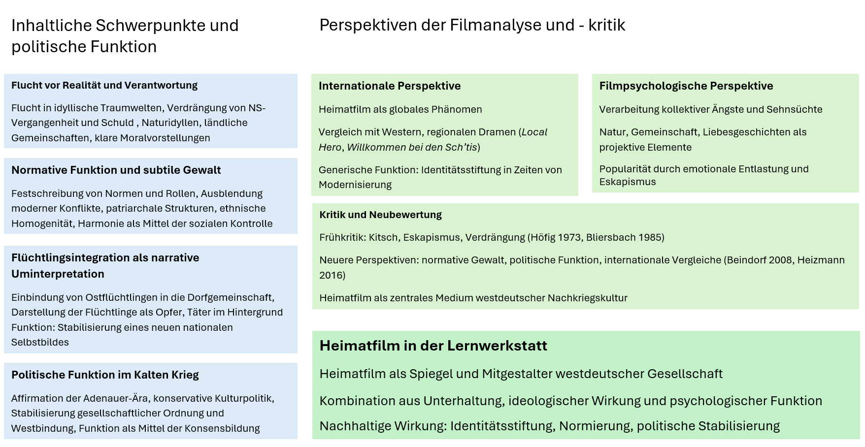 Die Popularität des Heimatfilms erklärt sich aus dieser Kombination von Unterhaltung, emotionaler Entlastung und ideologischer Wirkung. Die Filme boten einfache Lösungen für komplexe Probleme, stabilisierten die soziale Ordnung und vermittelten ein Gefühl der Zugehörigkeit. Gleichzeitig dienten sie als Mittel der gesellschaftlichen Konsensbildung und halfen, die Unsicherheiten der Nachkriegszeit zu bewältigen.