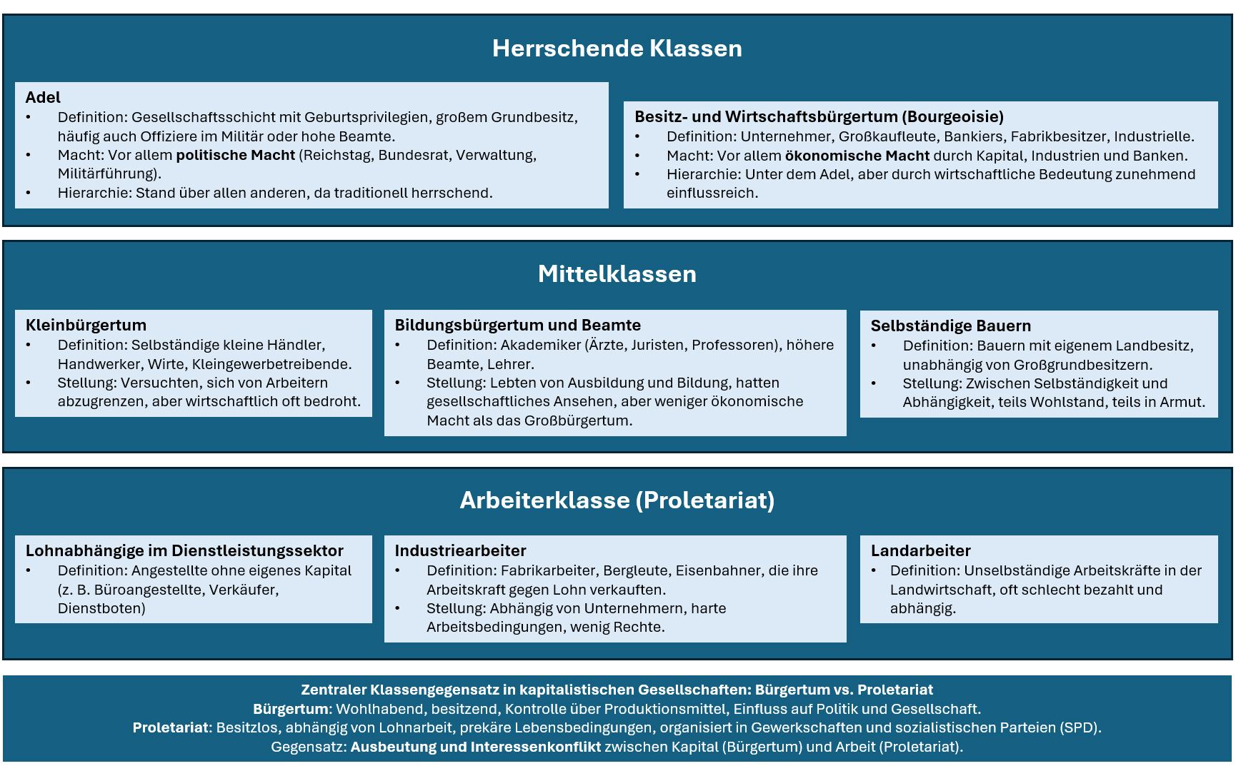 Die Klassengesellschaft des Kaiserreichs lässt sich aus marxistischer Perspektive als hybride Formation begreifen: Einerseits hochentwickelter Kapitalismus, andererseits feudale Rückständigkeit. Diese Kombination führte zu einer spezifischen politischen Konstellation, in der die Bourgeoisie ökonomisch dominierte, aber politisch im Bündnis mit dem Junkertum agierte.