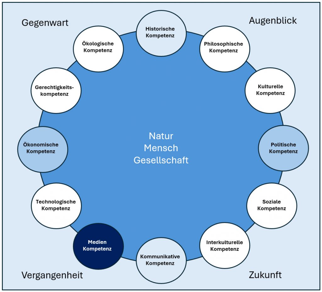 Medienkompetenz im Kontext des Gesellschaftskompetenzmodells umfasst die Fähigkeit, Medieninhalte kritisch zu analysieren, ihre gesellschaftliche Wirkung zu reflektieren und verantwortungsvoll mit ihnen umzugehen. Sie verbindet historisches Denken mit globalem Lernen und fördert die Einsicht, dass Medien Realität nicht nur abbilden, sondern konstruieren. Lernende sollen erkennen, wie mediale Darstellungen Machtverhältnisse beeinflussen, Debatten steuern und gesellschaftliche Entwicklungen mitgestalten. Medienkompetenz bedeutet daher nicht nur technische Fertigkeit, sondern auch ethische Urteilsfähigkeit, politische Sensibilität und die Fähigkeit zur kritischen Technologiefolgenabschätzung. Sie stärkt die Handlungsfähigkeit in komplexen, medial geprägten Lebenswelten und ist zentral für die Entwicklung eines reflektierten Medialitätsbewusstseins.