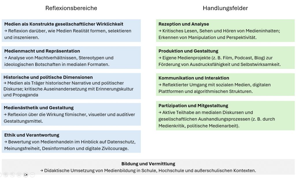 Diese Bereiche und Felder zeigen, wie Medienkompetenz im Sinne des Gesellschaftskompetenzmodells zur gesellschaftskritischen Demokratiebildung, historisch-politischen Urteilsfähigkeit und kulturellen Teilhabe beitragen kann.